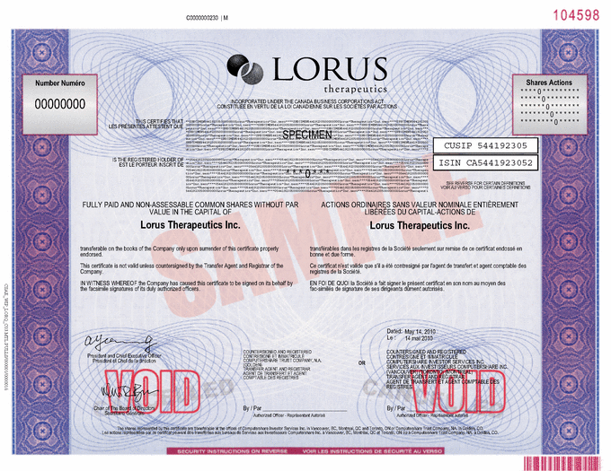 INCORPORATED UNDER THE CANADA BUSINESS CORPORATIONS ACT CONSTITUÉE EN VERTU DE LA LOI CANADIENNE SUR LES SOCIÉTÉS PAR ACTIONS SEE REVERSE FOR CERTAIN DEFINITIONS VOIR AU VERSO POUR CERTAINES DÉFINITIONS transferable on the books of the Company only upon surrender of this certificate properly endorsed. This certificate is not valid unless countersigned by the Transfer Agent and Registrar of the Company. IN WITNESS WHEREOF the Company has caused this certificate to be signed on its behalf by the facsimile signatures of its duly authorized officers. C0000000230 | M **SPECIMEN54419230500000000Lorus*Therapeutics*Inc.zero****SPECIMEN54419230500000000Lorus*Therapeutics*Inc.zero****SPECIMEN544192305 00000000Lorus*Therapeutics*Inc.zero****SPECIMEN54419230500000000Lorus*Therapeutics*Inc.zero****SPECIMEN54419230500000000Lorus*Thera peutics*Inc.zero****SPECIMEN54419230500000000Lorus*Therapeutics*Inc.zero****SPECIMEN54419230500000000Lorus*Therapeutics*Inc.zero*** *SPECIMEN54419230500000000Lorus*Therapeutics*Inc.zero****SPECIMEN54419230500000000Lorus*Therapeutics*Inc.zero****SPECIMEN5441923050 0000000Lorus*Therapeutics*Inc.zero****SPECIMEN54419230500000000Lorus*Therapeutics*Inc.zero****SPECIMEN54419230500000000Lorus*Therap eutics*Inc.zero****SPECIMEN54419230500000000Lorus*Therapeutics*Inc.zero****SPECIMEN54419230500000000Lorus*Therapeutics*Inc.zero**** SPECIMEN54419230500000000Lorus*Therapeutics*Inc.zero****SPECIMEN54419230500000000Lorus*Therapeutics*Inc.zero****SPECIMEN54419230500 000000Lorus*Therapeutics*Inc.zero****SPECIMEN54419230500000000Lorus*Therapeutics*Inc.zero****SPECIMEN54419230500000000Lorus*Therape utics*Inc.zero****SPECIMEN54419230500000000Lorus*Therapeutics*Inc.zero****SPECIMEN54419230500000000Lorus*Therapeutics*Inc.zero****S SPECIMEN **054419230500000000Lorus*Therapeutics*Inc.zero****054419230500000000Lorus*Therapeutics*Inc.zero****054419230500000000Lorus*Therape utics*Inc.zero****054419230500000000Lorus*Therapeutics*Inc.zero****054419230500000000Lorus*Therapeutics*Inc.zero****054419230500000 000Lorus*Therapeutics*Inc.zero****054419230500000000Lorus*Therapeutics*Inc.zero****054419230500000000Lorus*Therapeutics*Inc.zero*** *054419230500000000Lorus*Therapeutics*Inc.zero****054419230500000000Lorus*Therapeutics*Inc.zero****054419230500000000Lorus*Therapeu tics*Inc.zero****054419230500000000Lorus*Therapeutics*Inc.zero****054419230500000000Lorus*Therapeutics*Inc.zero****0544192305000000 00Lorus*Therapeutics*Inc.zero****054419230500000000Lorus*Therapeutics*Inc.zero****054419230500000000Lorus*Therapeutics*Inc.zero**** 054419230500000000Lorus*Therapeutics*Inc.zero****054419230500000000Lorus*Therapeutics*Inc.zero****054419230500000000Lorus*Therapeut ics*Inc.zero****054419230500000000Lorus*Therapeutics*Inc.zero****054419230500000000Lorus*Therapeutics*Inc.zero****05441923050000000 0Lorus*Therapeutics*Inc.zero****054419230500000000Lorus*Therapeutics*Inc.zero****054419230500000000Lorus*Therapeutics*Inc.zero****0 54419230500000000Lorus*Therapeutics*Inc.zero****054419230500000000Lorus*Therapeutics*Inc.zero****054419230500000000Lorus*Therapeuti * * * 0 * * * 00000000 Number Numéro Shares Actions FULLY PAID AND NON-ASSESSABLE COMMON SHARES WITHOUT PAR VALUE IN THE CAPITAL OF IS THE REGISTERED HOLDER OF EST LE PORTEUR INSCRIT DE THIS CERTIFIES THAT LES PRÉSENTES ATTESTENT QUE Dated: COUNTERSIGNED AND REGISTERED CONTRESIGNÉ ET IMMATRICULÉ COMPUTERSHARE TRUST COMPANY, N.A. (GOLDEN) TRANSFER AGENT AND REGISTRAR AGENT DE TRANSFERT ET AGENT COMPTABLE DES REGISTRES COUNTERSIGNED AND REGISTERED CONTRESIGNÉ ET IMMATRICULÉ COMPUTERSHARE INVESTOR SERVICES INC. SERVICES AUX INVESTISSEURS COMPUTERSHARE INC. (VANCOUVER) (TORONTO) (MONTREAL) TRANSFER AGENT AND REGISTRAR AGENT DE TRANSFERT ET AGENT COMPTABLE DES REGISTRES OR By / Par Authorized Officer - Représentant Autorisé By / Par Authorized Officer - Représentant autorisé President and Chief Executive Officer President et Chef de la diréction Chair of The Board of Directors Secrétaire Générale * * * * 0 * * * * * * * * * * * * * * 0 * * * * * * * * * * * * * * 0 * * * * * * * * * * * * * * 0 * * * * * * * * * * * * * * 0 * * * * * CUSIP 544192305 ISIN CA5441923052 transférables dans les registres de la Société seulement sur remise de ce certificat endossé en bonne et due forme. Ce certificat n'est valide que s'il a été contresigné par l'agent de transfert et agent comptable des registres de la Société. EN FOI DE QUOI la Société a fait signer le présent certificat en son nom au moyen des fac-similés de signature de ses dirigeants dûment autorisés. ACTIONS ORDINAIRES SANS VALEUR NOMINALE ENTIÈREMENT LIBÉRÉES DU CAPITAL-ACTIONS DE May 14, 2010 Le : 14 mai 2010 Lorus Therapeutics Inc. Lorus Therapeutics Inc. The shares represented by this certificate are transferable at the offices of Computershare Investor Services Inc. in Vancouver, BC, Montreal, QC and Toronto, ON or Computershare Trust Company, NA. in Golden, CO. Les actions représentées par ce certificat peuvent être transférées aux bureaux de Services aux Investisseurs Computershare Inc. à Vancouver, BC, Montréal, QC et Toronto, ON ou à Computershare Trust Company, NA. à Golden, CO. CSAE_WIP_LORQ_C03.MTL.PULLS/000001/000001/i |