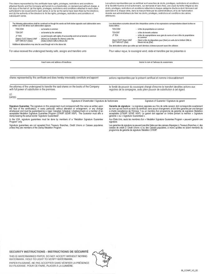 The shares represented by this certificate have rights, privileges, restrictions and conditions attached thereto and the Company will furnish to a shareholder, on demand and without charge, a full copy of the text of: (a) the rights, privileges, restrictions and conditions attached to each class authorized to be issued and to each series in so far as the same have been fixed by the directors; and (b) the authority of the directors to fix the rights, privileges, restrictions and conditions of subsequent series. Les actions représentées par ce certificat sont assorties de droits, privilèges, restrictions et conditions et la Société fournira à tout actionnaire, sur demande et sans frais, une copie du texte intégral a) des droits, privilèges, restrictions et conditions rattachés à chaque catégorie d'actions dont l'émission est autorisée et à chaque série, dans la mesure fixée par les administrateurs; et b) de l'autorisation donnée aux administrateurs de fixer les droits, privilèges, restrictions et conditions des séries ultérieures. The following abbreviations shall be construed as though the words set forth below opposite each abbreviation were written out in full where such abbreviation appears: TEN COM - as tenants in common TEN ENT - as tenants by the entireties JT TEN - as joint tenants with rights of survivorship and not as tenants in common (Name) CUST (Name) UNIF - (Name) as Custodian for (Name) under the GIFT MIN ACT (State) (State) Uniform Gifts to Minors Act Additional abbreviations may also be used though not in the above list. For value received the undersigned hereby sells, assigns and transfers unto Insert name and address of transferee shares represented by this certificate and does hereby irrevocably constitute and appoint the attorney of the undersigned to transfer the said shares on the books of the Company with full power of substitution in the premises. Les abreviations suivantes doivent etre interpretees comme si les expressions correspondantes etaient ecrites en toutes lettres: TEN COM - a titre de proprietaires en commun TEN ENT - a titre de tenants unitaires JT TEN - a titre de coproprietaires avec gain de survie et non a titre de proprietaires en commun (Norn) CUST (Norn) UNIF - (Norn) a titre de depositaire pour (Norn) en vertu de la Uniform Gifts to GIFT MIN ACT (Etat) Minors Act de (fiat) Des abreviations autres que celles qui sont donnees ci-dessus peuvent aussi etre utilisees. Pour valeur recue, le soussigne vend, cède et transfère par les presentes à Insèrer le nom et Iadresse du cessionnaire actions reprèsentèes par le prèsent certificat et nomme irrèvocablement le fondè de pouvoir du soussigne chargè dinscrire le transfert desdites actions aux registres de la compagnie, avec plein pouvoir de substitution à cet ègard. LE: DATED: Signature of Shareholder / Signature de Iactionnaire Signature of Guarantor / Signature du garant Signature Guarantee: The signature on this assignment must correspond with the name as written upon the face of the certificate(s), in every particular, without alteration or enlargement, or any change whatsoever and must be guaranteed by a major Canadian Schedule I chartered bank or a member of an acceptable Medallion Signature Guarantee Program (STAMP, SEMP, MSP). The Guarantor must affix a stamp bearing the actual words Signature Guaranteed. In the USA, signature guarantees must be done by members of a Medallion Signature Guarantee Program only. Signature guarantees are not accepted from Treasury Branches, Credit Unions or Caisses populaires unless they are members of the Stamp Medallion Program. Garantie de signature : La signature apposèe aux fins de cette cession doit correspondre exactement au nom qui est inscrit au recto du certificat, sans aucun changement, et doit ètre garantie par une banque a charte canadienne de IAnnexe 1 ou un membre dun programme de garantie de signature Medallion acceptable (STAMP, SEMP, MSP). Le garant doit apposer un timbre portant la mention « Signature garantie » ou « Signature Guaranteed ». Aux Ètats-Unis, seuls les membres dun « Medallion Signature Guarantee Program » peuvent garantir une signature. Les garanties de signature ne peuvent pas etre faites par des caisses depargne («Treasury Branches»), des caisses de credit (« Credit Unions ») ou des Caisses populaires, à moins quelles ne soient membres du programme de garantie de signature Medallion STAMP. SECURITY INSTRUCTIONS - INSTRUCTIONS DE SÈCURITÈ THIS IS WATERMARKED PAPER, DONOT ACCEPT WITHOUT NOTING WATERMARK HOLD TO LIGHT TO VERIFY WATERMARK. PAPER FILIGRANÈ, NE PAS ACCEPTER SANS VÈRIFIER LA PRÈSENCE DU FlLIGRANE. POUR CE FAIRE. PLACER A LA LUMIÈRE. BI_COMP_V2_02 |