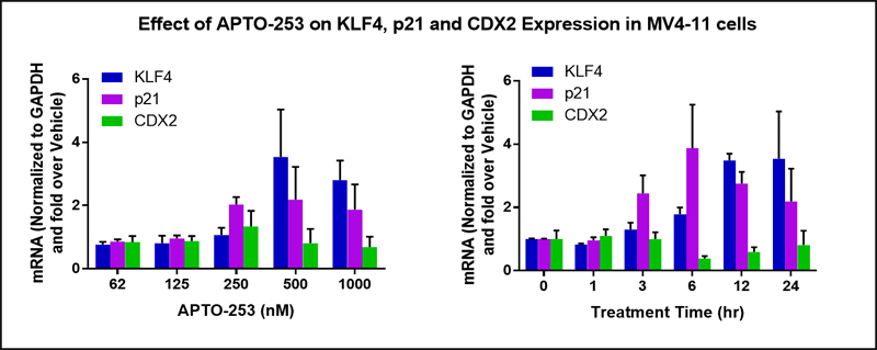Inappropriate expression of CDX2 in AML cells results in epigenetic silencing of the KLF4 gene and subsequent downstream silencing of the pro-apoptotic p21 gene. To characterize the effect of APTO-253 treatment of AML cells, the levels of CDX2, KLF4 and p21 gene expression were measured as a function of the concentration of APTO-253 and as a function treatment time. As shown in Figure 3, KLF4 and p21 gene expression increased in cells treated with APTO-253, while there was no change in the levels of CDX2 expression.
