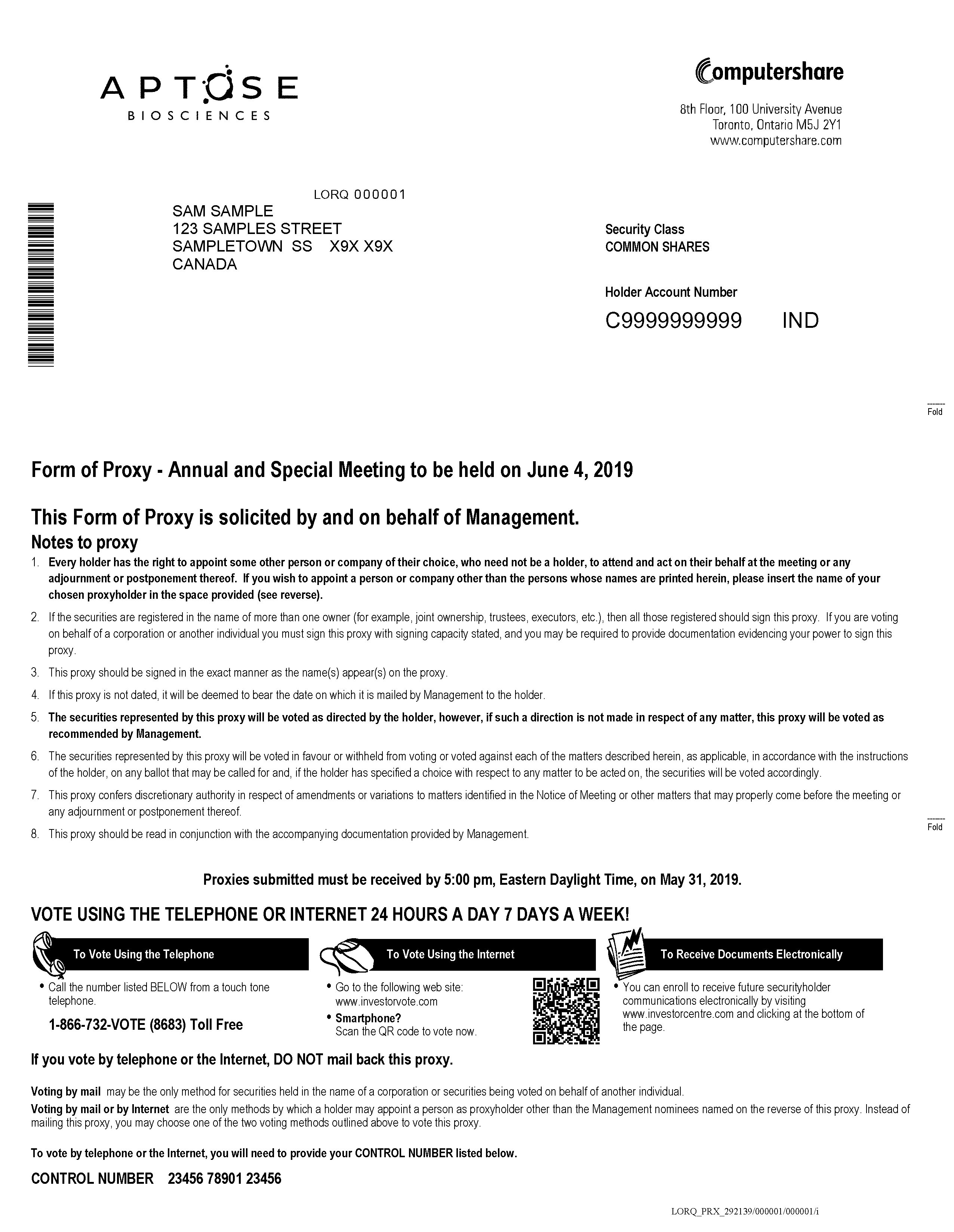 Our Notice of 2019 Annual and Special Meeting of Shareholders, Proxy Statement and Annual Report to Shareholders are available on the Corporation’s website at www.aptose.com in the Investors section.