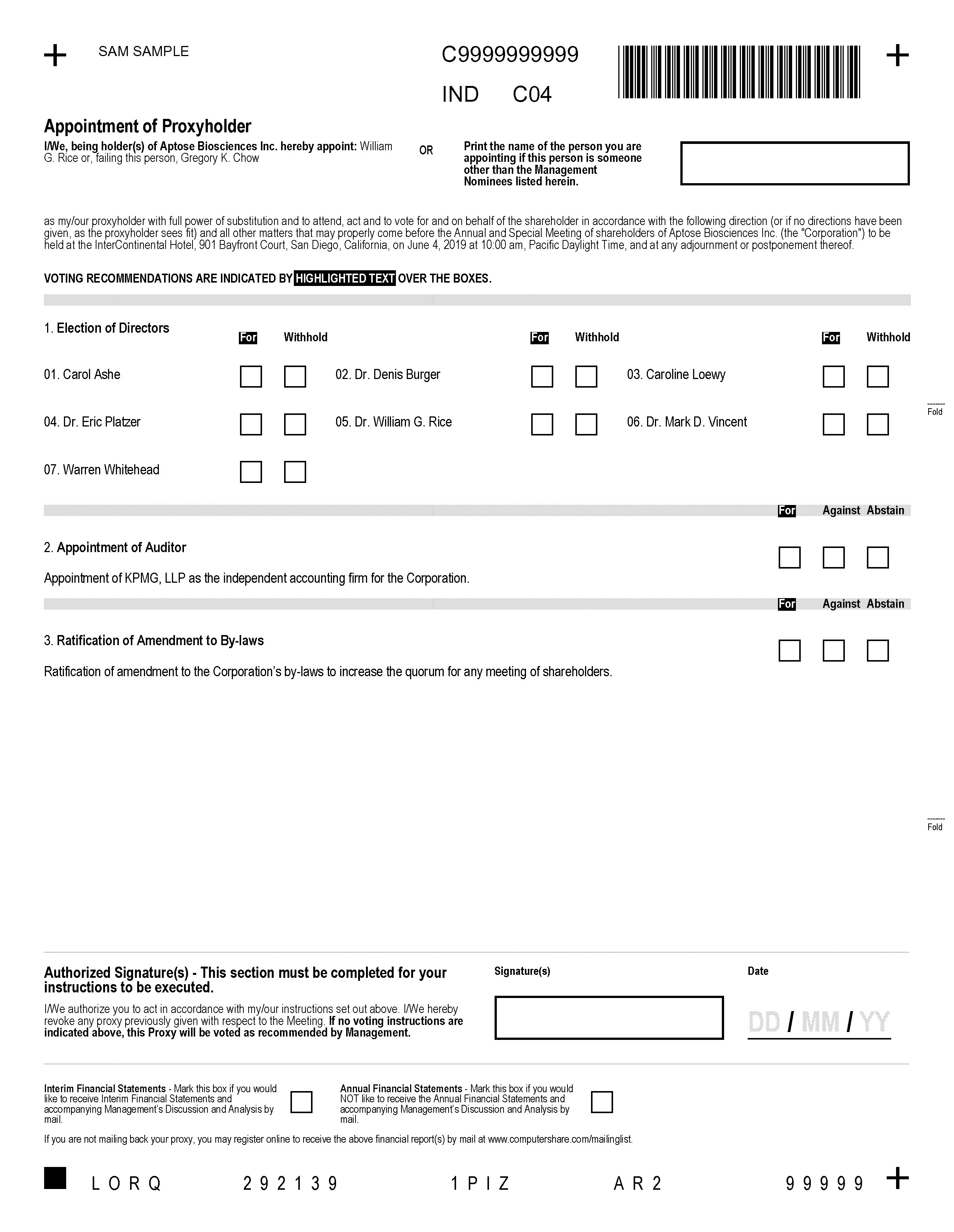 NOTICE IS HEREBY GIVEN that the annual and special meeting (the “Meeting”) of shareholders of Aptose Biosciences Inc. (the “Corporation”) will be held at the Intercontinental Hotel, 901 Bayfront Court, San Diego, California, 92101 United States of America on June 4, 2019 at 10:00AM (Pacific time).