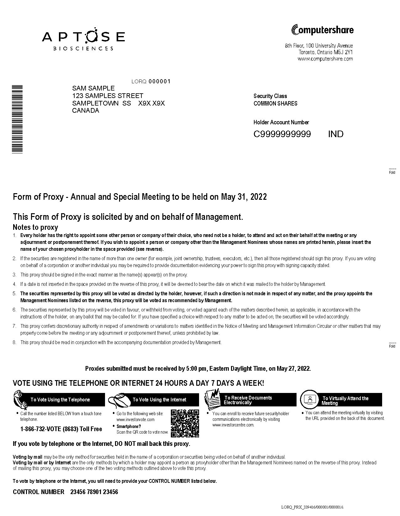 The Notice of Meeting, Proxy Statement and the form of proxy will be mailed to you on or around May 2, 2022. Detailed instructions regarding shareholders’ voting process are also available on our website at https://www.aptose.com/investors/news-events/ir-calendar.