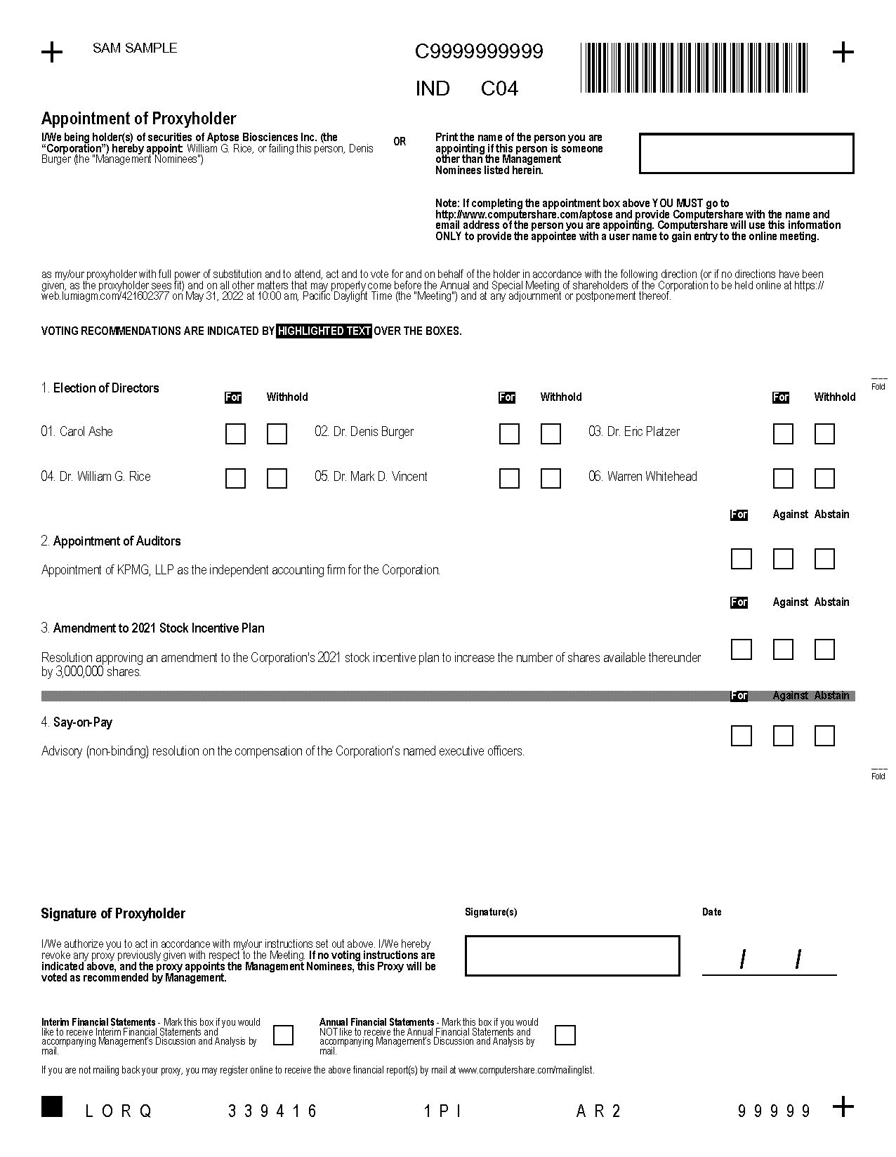 NOTICE IS HEREBY GIVEN that the annual and special meeting (the “Meeting”) of shareholders of Aptose Biosciences Inc. (the “Corporation”) will be held on May 31, 2022 at 10:00 a.m. (Pacific time). The Meeting will be conducted as an online only annual and special meeting. There will be no physical location for shareholders and duly appointed proxyholders to attend. Shareholders and duly appointed proxyholders may attend the virtual Meeting online at https://web.lumiagm.com/421602377, where they will be able to listen, vote, and submit questions during the Meeting’s live webcast.