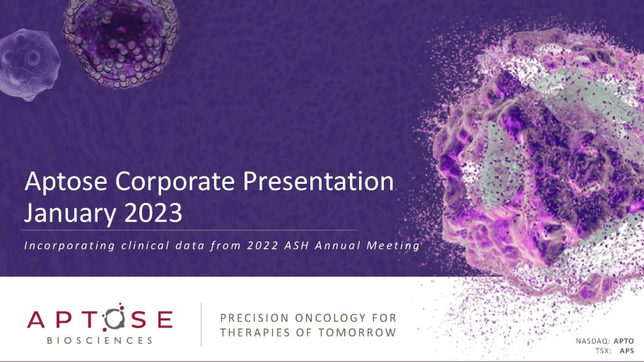 P R E C I S I O N O N C O L O G Y F O R T H E R A P I E S O F T O M O R R O W Aptose Corporate Presentation January 2023 NASDAQ: APTO TSX: APS I n c o r p o r a t i n g c l i n i c a l d a t a f r o m 2 0 2 2 A S H A n n u a l M e e t i n g