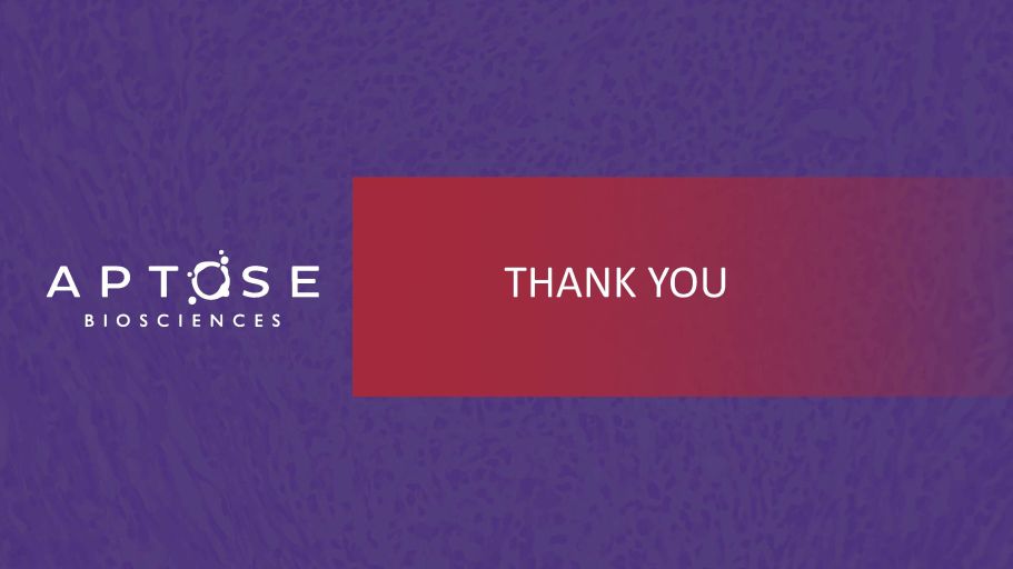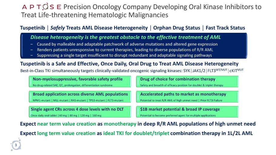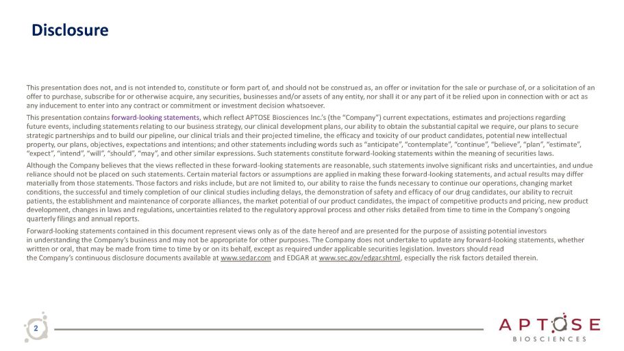 Disclosure 2 This presentation does not, and is not intended to, constitute or form part of, and should not be construed as, an offer or invitation for the sale or purchase of, or a solicitation of an offer to purchase, subscribe for or otherwise acquire, any securities, businesses and/or assets of any entity, nor shall it or any part of it be relied upon in connection with or act as any inducement to enter into any contract or commitment or investment decision whatsoever. This presentation contains forward - looking statements , which reflect APTOSE Biosciences Inc.’s (the “Company”) current expectations, estimates and projections regarding future events, including statements relating to our business strategy, our clinical development plans, our ability to obtain the substantial capital we require, our plans to secure strategic partnerships and to build our pipeline, our clinical trials and their projected timeline, the efficacy and toxicity of our product candidates, potential new intellectual property, our plans, objectives, expectations and intentions; and other statements including words such as “anticipate”, “contemplate”, “continue”, “believe”, “plan”, “estimate”, “expect”, “intend”, “will”, “should”, “may”, and other similar expressions. Such statements constitute forward - looking statements within the meaning of securities laws. Although the Company believes that the views reflected in these forward - looking statements are reasonable, such statements involve significant risks and uncertainties, and undue reliance should not be placed on such statements. Certain material factors or assumptions are applied in making these forward - looking statements, and actual results may differ materially from those statements. Those factors and risks include, but are not limited to, our ability to raise the funds necessary to continue our operations, changing market conditions, the successful and timely completion of our clinical studies including delays, the demonstration of safety and efficacy of our drug candidates, our ability to recruit patients, the establishment and maintenance of corporate alliances, the market potential of our product candidates, the impact of competitive products and pricing, new product development, changes in laws and regulations, uncertainties related to the regulatory approval process and other risks detailed from time to time in the Company’s ongoing quarterly filings and annual reports. Forward - looking statements contained in this document represent views only as of the date hereof and are presented for the purpose of assisting potential investors in understanding the Company’s business and may not be appropriate for other purposes. The Company does not undertake to update any forward - looking statements, whether written or oral, that may be made from time to time by or on its behalf, except as required under applicable securities legislation. Investors should read the Company’s continuous disclosure documents available at www.sedar.com and EDGAR at www.sec.gov/edgar.shtml , especially the risk factors detailed therein.