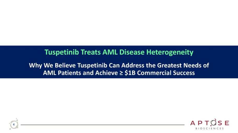 Precision Oncology Company Developing Oral Kinase Inhibitors to Treat Life - threatening Hematologic Malignancies Expect near term value creation as monotherapy in deep R/R AML populations of high unmet need Expect long term value creation as ideal TKI for doublet/triplet combination therapy in 1L/2L AML Tuspetinib │ Safely Treats AML Disease Heterogeneity │ Orphan Drug Status │ Fast Track Status Disease heterogeneity is the greatest obstacle to the effective treatment of AML ‒ Caused by malleable and adaptable patchwork of adverse mutations and altered gene expression ‒ Renders patients unresponsive to current therapies, leading to diverse populations of R/R AML ‒ Suppressing a single target insufficient to disrupt redundant and adaptable signaling pathways Tuspetinib is a Safe and Effective, Once Daily, Oral Drug to Treat AML Disease Heterogeneity Best - in - Class TKI simultaneously targets clinically - validated oncogenic signaling kinases: SYK│JAK1/2│FLT3 WT/MUT │cKIT MUT Non - myelosuppressive, favorable safety profile No drug - related SAE, QT C prolongation, differentiation syndrome Drug of choice for combination therapy Safety and breadth of efficacy position for doublet & triplet therapy Accelerated paths to market as monotherapy Potential to treat R/R AML of high unmet need │ Prior FLT3i Failure $1B market potential & broad IP coverage Potential to become preferred agent for multiple applications Single agent CRs across 4 dose levels with no DLT Once daily oral tablet │40 mg │ 80 mg │ 120 mg │ 160 mg Broad application across diverse AML populations NPM1 - mutant │ MLL - mutant | RAS - mutant │ TP53 - mutant │ FLT3 - mutant 3