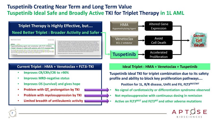 Tuspetinib Creating Near Term Value Ideal TKI Monotherapy for Accelerated Approval in R/R AML Who Failed Prior FLT3i Tuspetinib Accelerated Development May Offer x Value creation in 2023 and beyond x First approval in AML indication x Well tolerated therapy x Bridge to stem cell transplant x Longer survival and give hope! Tuspetinib Monotherapy • Active against all forms FLT3 and other targets • Responses in patients who failed prior FLT3i • Potential to address an unmet medical need FLT3 MUT AML Treated with FLT3 Inhibitors • Midostaurin • Quizartinib • Gilteritinib • Sorafenib R/R FLT3 MUT AML / Prior FLT3i Failures 3L+ R/R population with no approved options Planning a Phase 2 Accelerated Approval Path FLT3i Failure 6