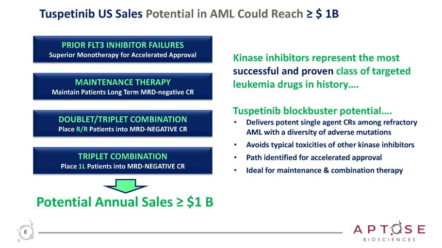 Tuspetinib Creating Near Term and Long Term Value Tuspetinib Ideal Safe and Broadly Active TKI for Triplet Therapy in 1L AML HMA Hypomethylating Agent Accelerated Proliferation Altered Gene Expression Avoid Cell Death Venetoclax BCL - 2 inhibitor FLT3i - TKI that Inhibits Proliferation Pathways Cancer Cell Death Tuspetinib ideal TKI for triplet combination due to its safety profile and ability to block key proliferation pathways…. Position for 1L, R/R disease, Unfit and Fit, FLT3 MUT/WT • No signal of cardiotoxicity or differentiation syndrome observed • Not myelosuppressive with continuous dosing in remission • Active on FLT3 MUT and FLT3 WT and other adverse mutations Ideal Triplet : HMA + Venetoclax + Tuspetinib Current Triplet : HMA + Venetoclax + FLT3i - TKI • Improves CR/CRh/CRi to >90% • Improves MRD - negative status • Improves OS (survival) and gives hope • Problem with QT c prolongation by TKI • Problem with myelosuppression by TKI • Limited breadth of antileukemic activity Triplet Therapy is Highly Effective, but…. Need Better Triplet : Broader Activity and Safer T usp e ti n i b 7