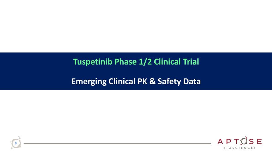 Tuspetinib US Sales Potential in AML Could Reach ≥ $ 1B Potential Annual Sales ≥ $1 B PRIOR FLT3 INHIBITOR FAILURES Superior Monotherapy for Accelerated Approval MAINTENANCE THERAPY Maintain Patients Long Term MRD - negative CR DOUBLET/TRIPLET COMBINATION Place R/R Patients into MRD - NEGATIVE CR TRIPLET COMBINATION Place 1L Patients into MRD - NEGATIVE CR Kinase inhibitors represent the most successful and proven class of targeted leukemia drugs in history…. Tuspetinib blockbuster potential…. • Delivers potent single agent CRs among refractory AML with a diversity of adverse mutations • Avoids typical toxicities of other kinase inhibitors • Path identified for accelerated approval • Ideal for maintenance & combination therapy 8