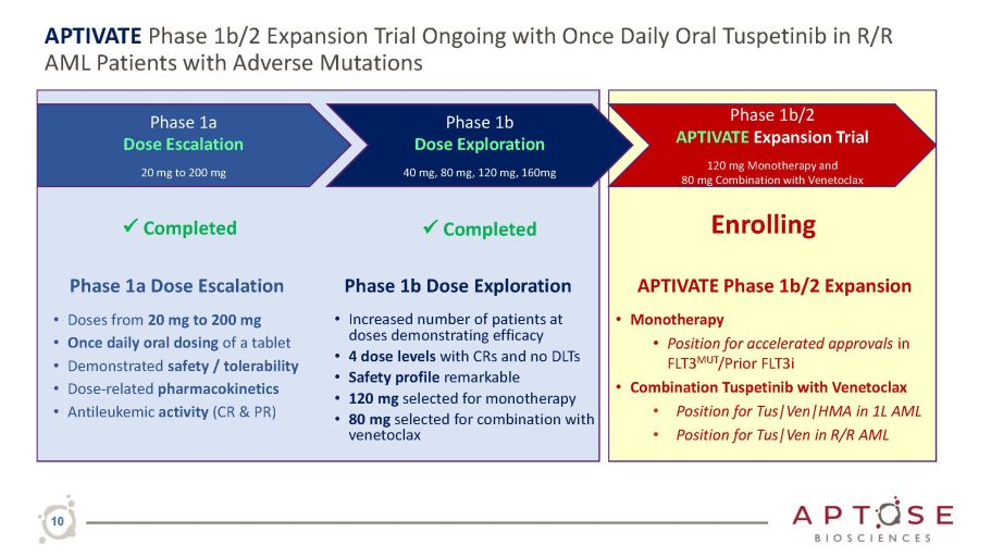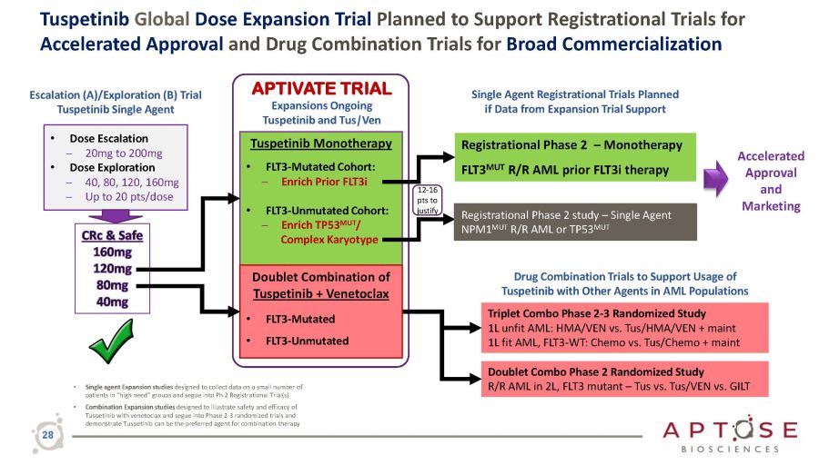 Tuspetinib Global Dose Expansion Trial Planned to Support Registrational Trials for Accelerated Approval and Drug Combination Trials for Broad Commercialization Doublet Combo Phase 2 Randomized Study R/R AML in 2L, FLT3 mutant – Tus vs. Tus/VEN vs. GILT Triplet Combo Phase 2 - 3 Randomized Study 1L unfit AML: HMA/VEN vs. Tus/HMA/VEN + maint 1L fit AML, FLT3 - WT: Chemo vs. Tus/Chemo + maint Drug Combination Trials to Support Usage of Tuspetinib with Other Agents in AML Populations • Single agent Expansion studies designed to collect data on a small number of patients in “high need” groups and segue into Ph 2 Registrational Trial(s) • Combination Expansion studies designed to illustrate safety and efficacy of Tuspetinib with venetoclax and segue into Phase 2 - 3 randomized trials and demonstrate Tuspetinib can be the preferred agent for combination therapy Escalation (A)/Exploration (B) Trial Tuspetinib Single Agent • Dose Escalation ─ 20mg to 200mg • Dose Exploration ─ 40, 80, 120, 160mg ─ Up to 20 pts/dose Tuspetinib Monotherapy • FLT3 - Mutated Cohort: ─ Enrich Prior FLT3i • FLT3 - Unmutated Cohort: ─ Enrich TP53 MUT / Complex Karyotype Doublet Combination of Tuspetinib + Venetoclax • FLT3 - Mutated • FLT3 - Unmutated APTIVATE TRIAL Expansions Ongoing Tuspetinib and Tus | Ven Registrational Phase 2 – Monotherapy FLT3 MUT R/R AML prior FLT3i therapy Single Agent Registrational Trials Planned if Data from Expansion Trial Support Accelerated Approval and Marketing Registrational Phase 2 study – Single Agent NPM1 MUT R/R AML or TP53 MUT 12 - 16 pts to justify 28