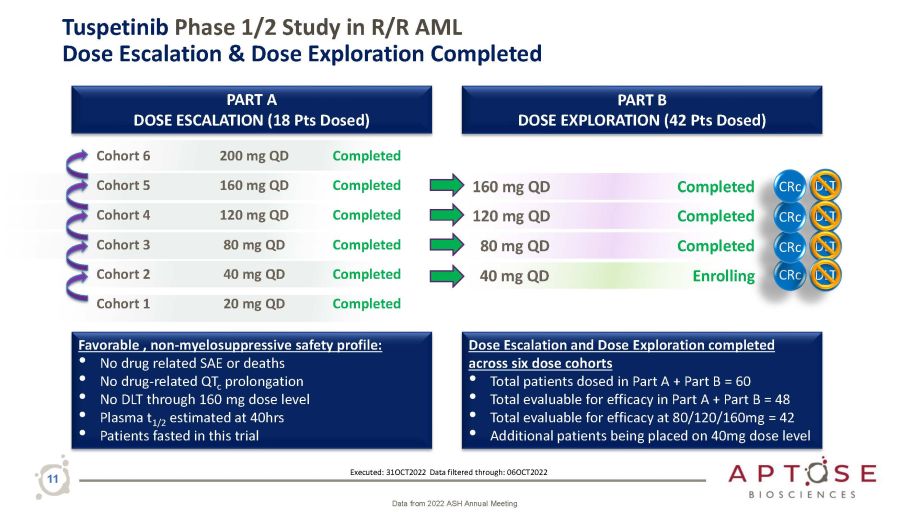APTIVATE Phase 1b/2 Expansion Trial Ongoing with Once Daily Oral Tuspetinib in R/R AML Patients with Adverse Mutations Phase 1a Dose Escalation • Doses from 20 mg to 200 mg • Once daily oral dosing of a tablet • Demonstrated safety / tolerability • Dose - related pharmacokinetics • Antileukemic activity (CR & PR) Phase 1a Dose Escalation 20 mg to 200 mg Phase 1b Dose Exploration 40 mg, 80 mg, 120 mg, 160mg Phase 1b/2 APTIVATE Expansion Trial 120 mg Monotherapy and 80 mg Combination with Venetoclax 10 Phase 1b Dose Exploration • Increased number of patients at doses demonstrating efficacy • 4 dose levels with CRs and no DLTs • Safety profile remarkable • 120 mg selected for monotherapy • 80 mg selected for combination with venetoclax APTIVATE Phase 1b/2 Expansion • Monotherapy • Position for accelerated approvals in FLT3 MUT /Prior FLT3i • Combination Tuspetinib with Venetoclax • Position for Tus|Ven|HMA in 1L AML • Position for Tus|Ven in R/R AML x Completed Enrolling x Completed