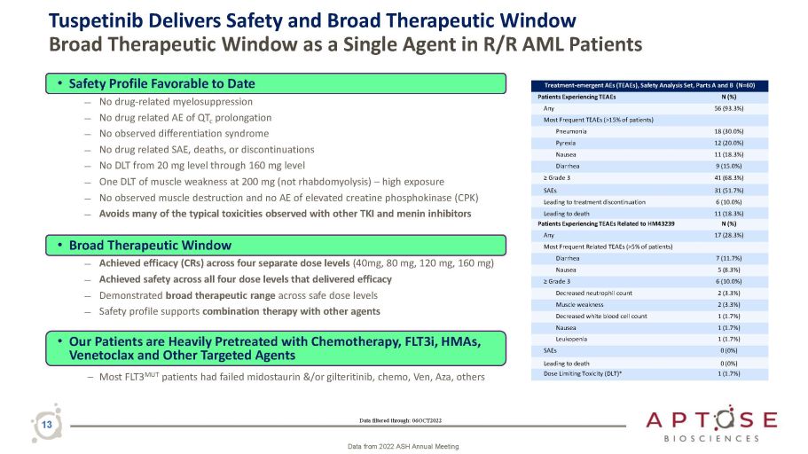 Tuspetinib Phase 1/2 Study in R/R AML: Patient Profiles • As of October 6, 2022, 60 patients have been treated across 6 dose levels (20, 40, 80, 120, 160, and 200 mg) in Dose Escalation (Part A) and Dose Exploration (Part B) at 8 sites in the US and Korea , Republic of (South). • Patients treated include male (58.3%), Asian (53.3%), or White (36.7%). • Median age = 61 years of age (range 18 - 84). • Patients heavily pre - treated , with prior cytotoxic chemotherapy (72%) , HMAs (60%), venetoclax (50%), prior HSCT (28.3%). • More than half (14/26) of FLT3 - mutated patients had been failed by prior FLT3 inhibitor . Data filtered through: 06OCT2022 12 Data from 2022 ASH Annual Meeting Patient Disease Characteristics FLT3 Mutation Status N (%) FLT3 MUT 26 (43.3%) FLT3 WT 33 (55.0%) Unknown 1 (1.7%) Prior Lines of AML Therapy - Mean (range) 2.7 (1 to 8) Type of Prior Therapy N (%) Prior Drug Therapy (Chemotherapy/Not Radiation) 60 (100%) Cytotoxic Chemotherapy 43 (71.7%) HSCT 17 (28.3%) FLT3 Inhibitor 14 (23.3%) Prior Therapy Number of Patients Receiving HMA or Venetoclax Among 60 Total Patients Dosed in Trial HMA (Azacitidine and/or Decitabine) 36 (60%) Venetoclax 30 (50%)