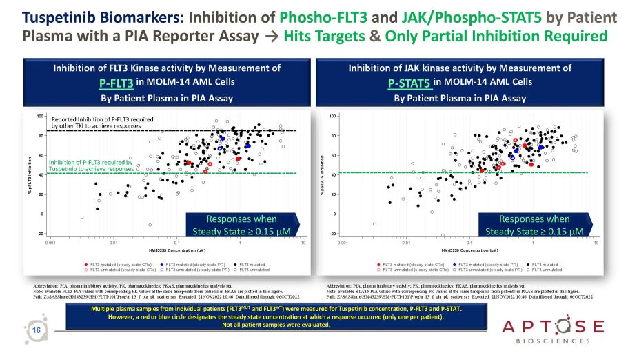 0.001 - 20 0 20 40 60 80 100 % pSTAT5 Inhibition 0.001 - 20 0 20 40 60 80 100 % pFLT3 Inhibition Tuspetinib Biomarkers: Inhibition of Phosho - FLT3 and JAK/Phospho - STAT5 by Patient Plasma with a PIA Reporter Assay → Hits Targets & Only Partial Inhibition Required Abbreviation: PIA, plasma inhibitory activity; PK, pharmacokinetics; PKAS, pharmacokinetics analysis set. Note: available FLT3 PIA values with corresponding PK values at the same timepoints from patients in PKAS are plotted in this figure. Path: Z: \ SASShare \ HM43239 \ HM - FLTI - 101 \ Prog \ a_13_f_pia_pk_scatter.sas Executed: 21NOV2022 10:46 Data filtered through: 06OCT2022 Inhibition of FLT3 Kinase activity by Measurement of P - FLT3 in MOLM - 14 AML Cells By Patient Plasma in PIA Assay Abbreviation: PIA, plasma inhibitory activity; PK, pharmacokinetics; PKAS, pharmacokinetics analysis set. Note: available STAT5 PIA values with corresponding PK values at the same timepoints from patients in PKAS are plotted in this figure. Path: Z: \ SASShare \ HM43239 \ HM - FLTI - 101 \ Prog \ a_13_f_pia_pk_scatter.sas Executed: 21NOV2022 10:46 Data filtered through: 06OCT2022 Inhibition of JAK kinase activity by Measurement of P - STAT5 in MOLM - 14 AML Cells By Patient Plasma in PIA Assay Responses when Steady State ≥ 0.15 µM Responses when Steady State ≥ 0.15 µM Reported Inhibition of P - FLT3 required by other TKI to achieve responses Inhibition of P - FLT3 required by Tuspetinib to achieve responses Multiple plasma samples from individual patients (FLT3 MUT and FLT3 WT ) were measured for Tuspetinib concentration, P - FLT3 and P - STAT. However, a red or blue circle designates the steady state concentration at which a response occurred (only one per patient). Not all patient samples were evaluated. 16