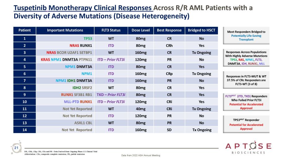 R/R AML Patients Achieving Clinical Responses with Tuspetinib Monotherapy Swimmer Plot of Responses Reported to Date Data from 2022 ASH Annual Meeting 20 Abbreviation: CR, complete response; CRh, complete response with partial hematologic recovery; CRi, complete response with incomplete hematologic recovery; CRp, complete response with incomplete platelet recovery; HSCT, hematopoietic stem cell transplantation; ND, not done; NE, not evaluable; PD, progressive disease; PR, partial remission. Note: 'Ongoing' means treatment is still ongoing; 'Remain Alive' indicates patients’ status in follow - up after treatment termination; The right arrow at the end of horizontal bar indicates patients are still on study, whereas without the right arrow indicates patients discontinued from study. Note: The bone marrow aspiration/biopsy date was used as response date. Each response assessed at a regular visit is considered to have started 1 cycle before the assessment; however the start of the response is considered the integer part of (study day/28) if the response occurred at the End of Treatment visit. *Indicates patients who received prior FLT3 inhibitors, including gilteritinib and/or midostaurin. Executed: 04JAN2023 10:07 Data filtered through: 06OCT20 1 2 3 4 5 6 7 8 9 10 11 12 13 14 15 16 17 18 19 20 21 22 23 24 Duration of Treatment in Cycle Death CR NE HSCT/Remain Alive Remain Alive CRi CRh CR PD Remain Alive CRh HSCT/Remain Alive CRi HSCT/Remain Alive CR HSCT/Remain Alive PD HSCT/Remain Alive CRh CRp CR Ongoing PR CRh CR CRh Refractory PR Remain Alive PR Refractory Refractory PR Refractory ND CRp Ongoing CRi Ongoing CRi CRh Refractory CRi 120 mg FLT3 TKD * 80 mg 160 mg 160 mg 120 mg 120 mg 80 mg 80 mg 40 mg 160 mg 80 mg 80 mg 80 mg Treatment FLT3 WT FLT3 WT FLT3 WT FLT3 WT FLT3 WT FLT3 ITD FLT3 ITD FLT3 ITD FLT3 ITD FLT3 ITD * FLT3 ITD * FLT3 ITD Deceased TP53 MUT Most bridged to potentially life - saving transplant TP53 MUT demonstrates breadth, durability & continuous dosing without myelosuppression RESPONDERS Responses achieved across four dose levels Durability observed when - /+ HSCT unavailable