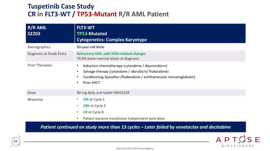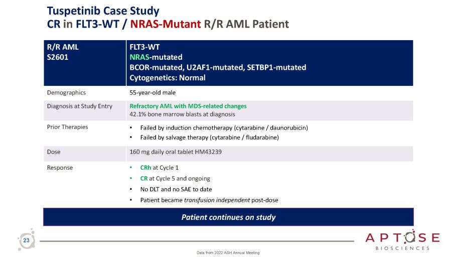 Tuspetinib Case Study CR in FLT3 - WT / NRAS - Mutant R/R AML Patient 23 Data from 2022 ASH Annual Meeting R/R AML S2601 FLT3 - WT NRAS - mutated BCOR - mutated, U2AF1 - mutated, SETBP1 - mutated Cytogenetics: Normal Demographics 55 - year - old male Diagnosis at Study Entry Refractory AML with MDS - related changes 42.1% bone marrow blasts at diagnosis Prior Therapies • Failed by induction chemotherapy (cytarabine / daunorubicin) • Failed by salvage therapy (cytarabine / fludarabine) Dose 160 mg daily oral tablet HM43239 Response • CRh at Cycle 1 • CR at Cycle 5 and ongoing • No DLT and no SAE to date • Patient became transfusion independent post - dose Patient continues on study