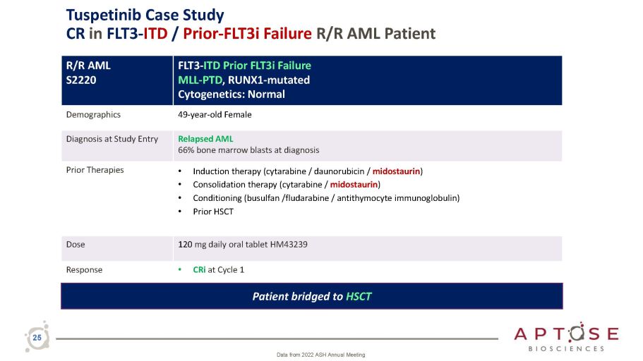 R/R AML S2203 FLT3 - WT TP53 - Mutated Cytogenetics: Complex Karyotype Demographics 60 - year - old Male Diagnosis at Study Entry Refractory AML with MDS - related changes 70.8% bone marrow blasts at diagnosis Prior Therapies • Induction chemotherapy (cytarabine / daunorubicin) • Salvage therapy (cytarabine / idarubicin/ fludarabine) • Conditioning (busulfan /fludarabine / antithymocyte immunoglobulin) • Prior HSCT Dose 80 mg daily oral tablet HM43239 Response • CRi at Cycle 1 • CRh at Cycle 5 • CR at Cycle 8 • Patient became transfusion independent post - dose Patient continued on study more than 13 cycles – Later failed by venetoclax and decitabine 24 Data from 2022 ASH Annual Meeting Tuspetinib Case Study CR in FLT3 - WT / TP53 - Mutant R/R AML Patient
