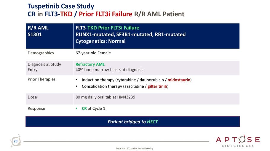 R/R AML S2220 FLT 3 - ITD Prior FLT 3 i Failure MLL - PTD , RUNX 1 - mutated Cytogenetics : Normal Demographics 49 - year - old Female Diagnosis at Study Entry Relapsed AML 66% bone marrow blasts at diagnosis Prior Therapies • Induction therapy (cytarabine / daunorubicin / midostaurin ) • Consolidation therapy (cytarabine / midostaurin ) • Conditioning (busulfan /fludarabine / antithymocyte immunoglobulin) • Prior HSCT Dose 120 mg daily oral tablet HM43239 Response • CRi at Cycle 1 Patient bridged to HSCT 25 Data from 2022 ASH Annual Meeting Tuspetinib Case Study CR in FLT3 - ITD / Prior - FLT3i Failure R/R AML Patient