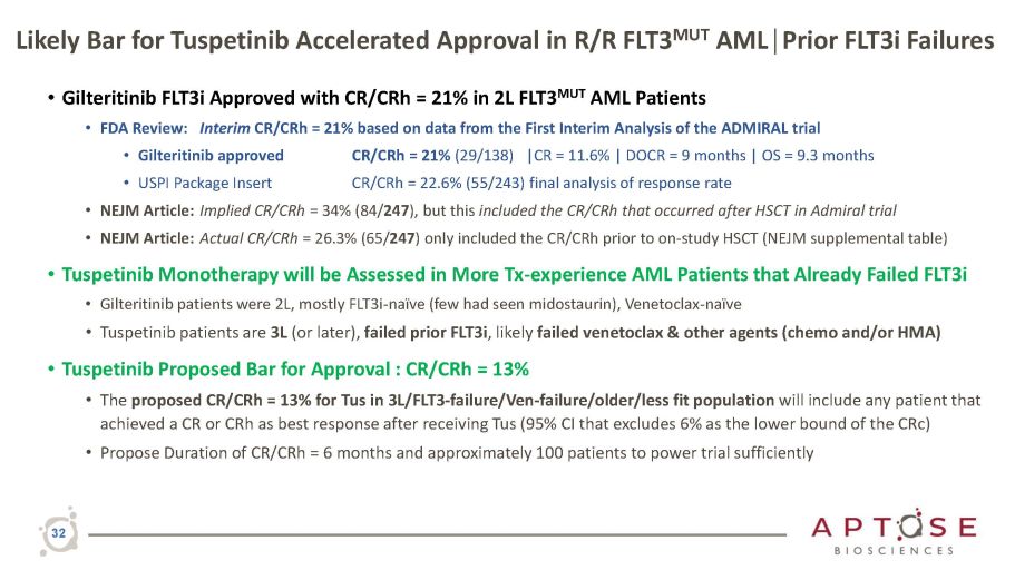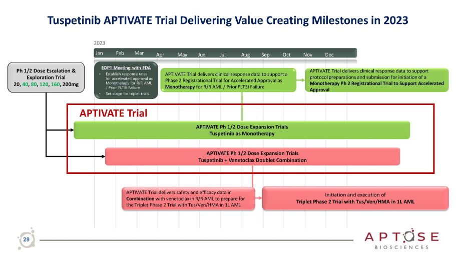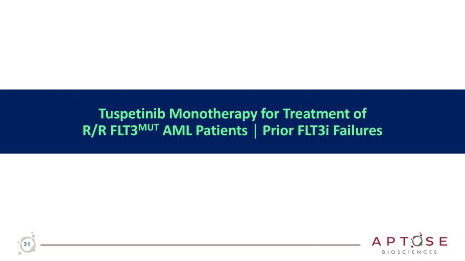 Tuspetinib APTIVATE Trial Delivering Value Creating Milestones in 2023 2H 2023 : Potential Accelerated Approval path identified for Doublet Phase 2 Trial with Tus/Ven in R/R AML 2H 2023 : Triplet Phase 2 Trial initiation with “all oral” Tus/Ven/HMA in 1L AML Tuspetinib as Monotherapy 1Q 2023 : EOP1 Meeting with FDA to establish response rates required for accelerated approval: Monotherapy for R/R AML / Prior FLT3i Failure 2H 2023 : APTIVATE Trial deliver early response data to support development concept: Phase 2 Registrational Trial for an Accelerated Approval as Monotherapy for R/R AML / Prior FLT3i Failure 2H 2023 : APTIVATE Trial deliver response rates to support a protocol submission: Phase 2 Registrational Trial for an Accelerated Approval as Monotherapy for R/R AML / Prior FLT3i Failure Tuspetinib in Combination 1H 2023 : APTIVATE Trial demonstrate safety and efficacy in combination with venetoclax in R/R AML 30