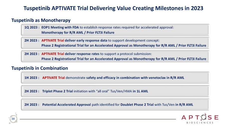 Apr May Jun Jul Aug Sep Oct Nov Dec APTIVATE Trial delivers clinical response data to support protocol preparations and submission for initiation of a Monotherapy Ph 2 Registrational Trial to Support Accelerated Approval Ph 1/2 Dose Escalation & Exploration Trial 20, 40 , 80 , 120 , 160 , 200mg APTIVATE Ph 1/2 Dose Expansion Trials Tuspetinib as Monotherapy APTIVATE Ph 1/2 Dose Expansion Trials Tuspetinib + Venetoclax Doublet Combination Initiation and execution of Triplet Phase 2 Trial with Tus/Ven/HMA in 1L AML APTIVATE Trial delivers safety and efficacy data in Combination with venetoclax in R/R AML to prepare for the Triplet Phase 2 Trial with Tus/Ven/HMA in 1L AML 2023 Jan Feb Mar EOP1 Meeting with FDA • Establish response rates for accelerated approval as Monotherapy for R/R AML / Prior FLT3i Failure • Set stage for triplet trials APTIVATE Trial delivers clinical response data to support a Phase 2 Registrational Trial for Accelerated Approval as Monotherapy for R/R AML / Prior FLT3i Failure APTIVATE Trial 29 Tuspetinib APTIVATE Trial Delivering Value Creating Milestones in 2023