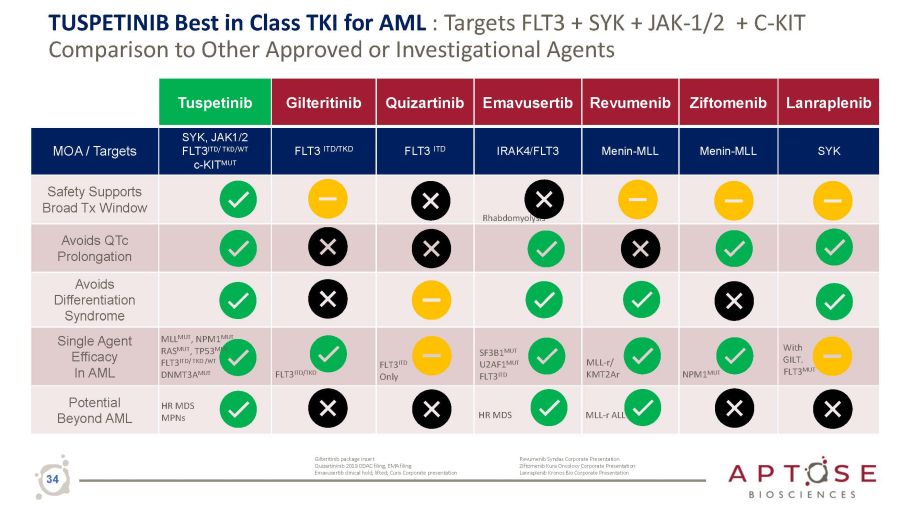 Tuspetinib Safely Delivers Monotherapy Responses Across Diverse AML Populations Example AML Populations with Adverse Mutations • TP53 - mutant • RAS - mutant • NPM1 - mutant - /+ FLT3 - mutant • FLT3 - mutant • FLT3 - mutant failed prior FLT3i therapy % of AML Patients 8 - 10% 15 - 40% 30% / 15% 25 - 30% 15 - 20% Immediate Development Plans for R/R AML • Monotherapy for R/R FLT3 - mutant AML who failed Prior FLT3 inhibitors (FLT3 MUT /Prior FLT3i) • Combination Therapy with venetoclax for AML patients who failed standard therapies Immediate Development for 1L AML • Triple combination in fit and unfit patients, FLT3 - mutant and FLT3 - unmutated 33 Mutation - Enriched Groups of AML Patients ORR C R / C R h / C R i TP53 MUT │ Complex Karyotype 1/3 (33%) 1 / 3 ( 3 3 % ) N/K - RAS MUT 3/8 (38%) 2 Best - in - Class TKI to Treat AML Disease Heterogeneity ‒ Safety and High Response Rates: ORR (up to 75%) and CR/CRh/CRi (up to 50%) ‒ Among Efficacy Evaluable R/R AML Patients From 40, 80, 120, 160mg Dose Levels and with No DLT ‒ Impressive Response Rates for Any Single Mutant Group → More Impressive to See Responses in Multiple Mutant Groups Data from 2022 ASH Annual Meeting