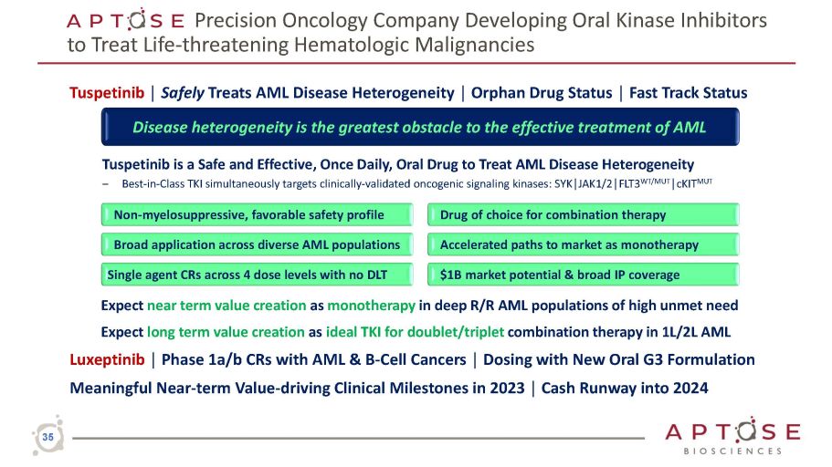 TUSPETINIB Best in Class TKI for AML : Targets FLT3 + SYK + JAK - 1/2 + C - KIT Comparison to Other Approved or Investigational Agents Tuspetinib Gilteritinib Quizartinib Emavusertib Revumenib Ziftomenib Lanraplenib MOA / Targets SYK, JAK1/2 FLT3 ITD/ TKD/WT c - KIT MUT FLT3 ITD/TKD FLT3 ITD IRAK4/FLT3 Menin - MLL Menin - MLL SYK Safety Supports Broad Tx Window Rhabdomyolysis Avoids QTc Prolongation Avoids Differentiation Syndrome Single Agent Efficacy In AML MLL MUT , NPM1 MUT RAS MUT , TP53 MUT FLT3 ITD / TKD / WT DNMT3A MUT FLT3 ITD/TKD FLT3 ITD Only SF 3 B 1 MUT U 2 AF 1 MUT FLT 3 ITD MLL - r/ KMT2Ar NPM1 MUT With GILT. FLT3 MUT Potential Beyond AML HR MDS MPNs HR MDS MLL - r ALL Gilteritinib package insert Quizartininib 2019 ODAC filing, EMA filing Emavusertib clinical hold, lifted; Curis Corporate presentation Revumenib Syndax Corporate Presentation Ziftomenib Kura Oncolocy Corporate Presentation Lanraplenib Kronos Bio Corporate Presentation 34