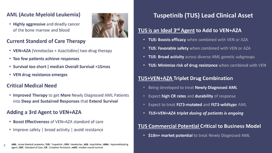 AML (Acute Myeloid Leukemia) • Highly aggressive and deadly cancer of the bone marrow and blood Current Standard of Care Therapy • VEN+AZA (Venetoclax + Azacitidine) two drug therapy • Too few patients achieve responses • Survival too short | median Overall Survival <15mos • VEN drug resistance emerges Critical Medical Need • Improved Therapy to get More Newly Diagnosed AML Patients into Deep and Sustained Responses that Extend Survival Adding a 3rd Agent to VEN +AZA • Boost Effectiveness of VEN+AZA standard of care • Improve safety | broad activity | avoid resistance Tuspetinib (TUS) Lead Clinical Asset TUS is an Ideal 3 rd Agent to Add to VEN+AZA • TUS: Boosts efficacy when combined with VEN or AZA • TUS : Favorable safety when combined with VEN or AZA • TUS : Broad activity across diverse AML genetic subgroups • TUS: Minimize risk of drug resistance when combined with VEN TUS+VEN+AZA Triplet Drug Combination • Being developed to treat Newly Diagnosed AML • Expect high CR rates and durability of response • Expect to treat FLT3 - mutated and FLT3 - wildtyp e AML • TUS+VEN+AZA triplet dosing of patients is ongoing TUS Commercial Potential Critical to Business Model • $1Bn+ market potential to treat Newly Diagnosed AML AML : Acute Myeloid Leukemia ; TUS : Tuspetinib ; VEN : Venetoclax ; AZA : Azacitidine ; HMA : Hypomethylating agent ; SOC : Standard of Care ; CR : Complete Remission ; mOS : median overall survival 2