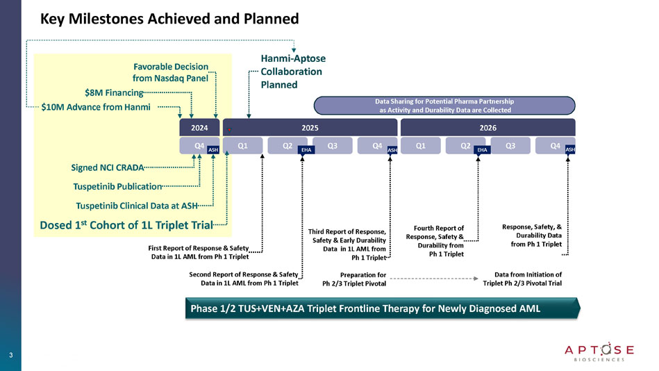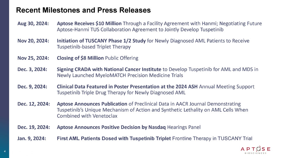 3 Q4 2024 ASH Key Milestones Achieved and Planned Q1 Q2 Q3 Q4 2025 Q1 Q2 Q3 Q4 2026 First Report of Response & Safety Data in 1L AML from Ph 1 Triplet Second Report of Response & Safety Data in 1L AML from Ph 1 Triplet Third Report of Response , Safety & Early Durability Data in 1L AML from Ph 1 Triplet Preparation for Ph 2/3 Triplet Pivotal Fourth Report of Response, Safety & Durability from Ph 1 Triplet 3 Response, Safety , & Durability Data from Ph 1 Triplet Data from Initiation of Triplet Ph 2/3 Pivotal Trial Phase 1/2 TUS+VEN+AZA Triplet Frontline Therapy for Newly Diagnosed AML $10M Advance from Hanmi Hanmi - Aptose Collaboration Planned $8M Financing Signed NCI CRADA Dosed 1 st Cohort of 1L Triplet Trial Tuspetinib Publication Tuspetinib Clinical Data at ASH Favorable Decision from Nasdaq Panel Data Sharing for Potential Pharma Partnership as Activity and Durability Data are Collected ASH ASH EHA EHA