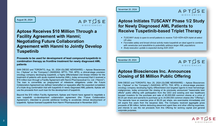 4 Recent Milestones and Press Releases 4 Aug 30, 2024: Aptose Receives $10 Million Through a Facility Agreement with Hanmi; Negotiating Future Aptose - Hanmi TUS Collaboration Agreement to Jointly Develop Tuspetinib Nov 20, 2024: Initiation of TUSCANY Phase 1/2 Study for Newly Diagnosed AML Patients to Receive Tuspetinib - based Triplet Therapy Nov 25, 2024: Closing of $8 Million Public Offering Dec. 3, 2024: Signing CRADA with National Cancer Institute to Develop Tuspetinib for AML and MDS in Newly Launched MyeloMATCH Precision Medicine Trials Dec. 9, 2024: Clinical Data Featured in Poster Presentation at the 2024 ASH Annual Meeting Support Tuspetinib Triple Drug Therapy for Newly Diagnosed AML Dec. 12, 2024: Aptose Announces Publication of Preclinical Data in AACR Journal Demonstrating Tuspetinib’s Unique Mechanism of Action and Synthetic Lethality on AML Cells When Combined with Venetoclax Dec. 19, 2024: Aptose Announces Positive Decision by Nasdaq Hearings Panel Jan. 9, 2024: First AML Patients Dosed with Tuspetinib Triplet Frontline Therapy in TUSCANY Trial