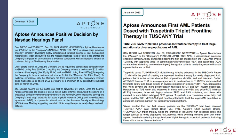 Aptose Precision oncology company developing oral targeted agents to treat hematologic malignancies Corporate Presentation January 2025 Tuspetinib in Frontline Triple Drug Therapy to Treat Newly Diagnosed AML 1 NASDAQ: APTO TSX: APS