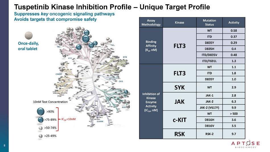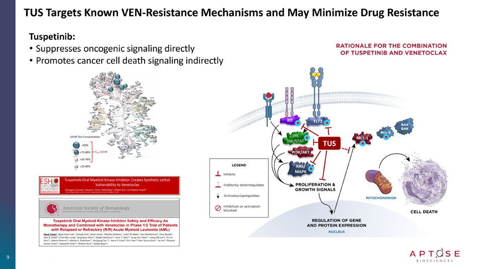 8 Tuspetinib Kinase Inhibition Profile – Unique Target Profile Suppresses key oncogenic signaling pathways Avoids targets that compromise safety 8 10nM Test Concentration >90% >75 - 89% >50 - 74% >25 - 49% PDGFR β HPK1 TRKC TRKB JAK2 JAK1 FLT1 MLK2 FGFR 3/4 FLT4 MLK3 MLK1 LOK PKCg LRRK2 ABL RET PDGFRb YES LCK SRC EPHA7 MUT - KIT PKCb CK2a2 PKCd DRK1b CLK2 PKN1 ARK5 LYN DDR1 STK39 Tie2 FLT3 IGF1R MUSK SYK TRKA FDFR2 ROS IC 50 <10nM RSK2 Activity Mutation Status Kinase Assay Methodology 0.58 WT FLT3 Binding Affinity (K D , nM) 0.37 ITD 0.29 D835Y 0.4 D835H 0.48 ITD/D835V 1.3 ITD/F691L 1.1 WT FLT3 Inhibition of Kinase Enzyme Activity (IC 50 , nM) 1.8 ITD 1.0 D835Y 2.9 WT SYK 2.8 JAK - 1 JAK 6.3 JAK - 2 9.9 JAK - 2 (V617F) > 500 WT c - KIT 3.6 D816H 3.5 D816V 9.7 RSK - 2 RSK Once - daily, oral tablet
