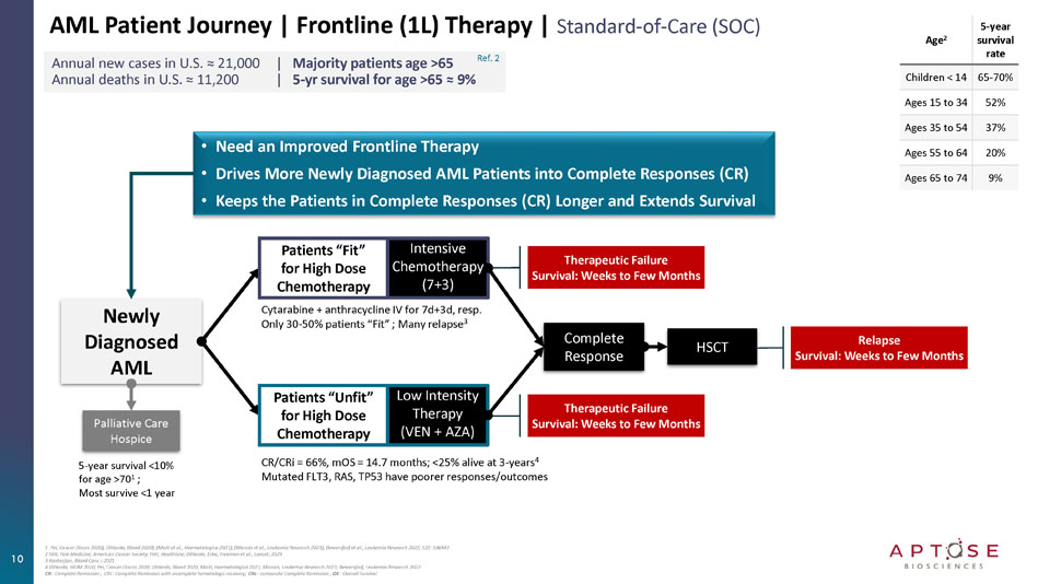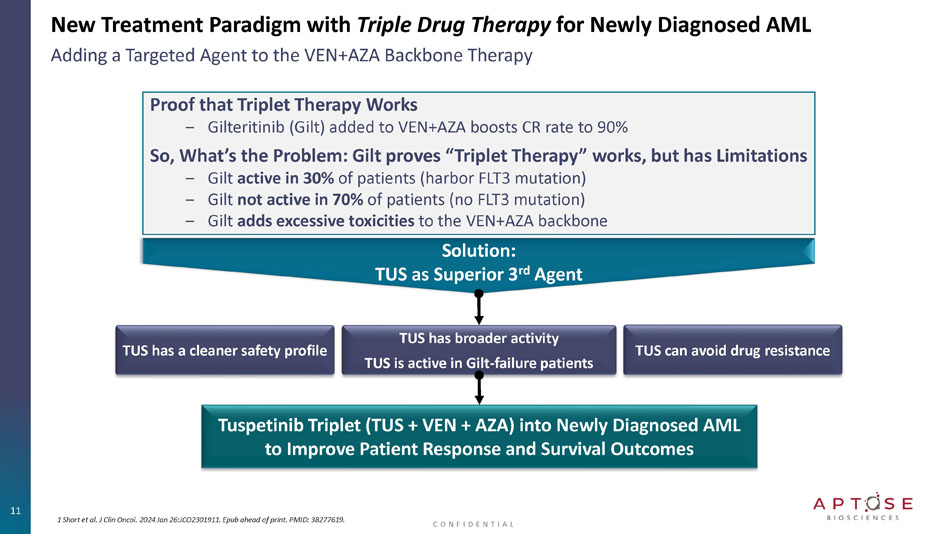 10 10 Newly Diagnosed AML Intensive Chemotherapy (7+3) Low Intensity Therapy (VEN + AZA) AML Patient Journey | Frontline (1L) Therapy | Standard - of - Care (SOC) Palliative Care Hospice 5 - year survival <10% for age >70 1 ; Most survive <1 year Patients “Unfit” for High Dose Chemotherapy Patients “Fit” for High Dose Chemotherapy • Need an Improved Frontline Therapy • Drives More Newly Diagnosed AML Patients into Complete Responses (CR) • Keeps the Patients in Complete Responses (CR) Longer and Extends Survival Cytarabine + anthracycline IV for 7d+3d, resp. Only 30 - 50% patients “Fit” ; Many relapse 3 5 - year survival rate Age 2 65 - 70% Children < 14 52% Ages 15 to 34 37% Ages 35 to 54 20% Ages 55 to 64 9% Ages 65 to 74 CR/CRi = 66%, mOS = 14.7 months; <25% alive at 3 - years 4 Mutated FLT3, RAS, TP53 have poorer responses/outcomes 1 Pei, Cancer Discos 2020); DiNardo, Blood 2020); ( Maiti et al., Haematologica 2021); (Mannis et al., Leukemia Research 2023); Bewersforf et al., Leukemia Research 2022; 122: 106942 2 NIH; Yale Medicine; American Cancer Society; NIH; Healthline; DiNardo, Erba, Freeman et al., Lancet, 2023 3 Kantarjian , Blood Canc J 2021 4 DiNardo, NEJM 2020; Pei, Cancer Discos 2020; DiNardo, Blood 2020; Maiti , Haematologica 2021; Mannis, Leukemia Research 2023; Bewersforf , Leukemia Research 2022 CR : Complete Remission ; CRi : Complete Remission with incomplete hematologic recovery; CRc : composite Complete Remission ; OS : Overall Survival Annual new cases in U.S. ≈ 21,000 | Majority patients age >65 Annual deaths in U.S. ≈ 11,200 | 5 - yr survival for age >65 ≈ 9% Ref. 2 Complete Response HSCT Therapeutic Failure Survival: Weeks to Few Months Relapse Survival: Weeks to Few Months Therapeutic Failure Survival: Weeks to Few Months