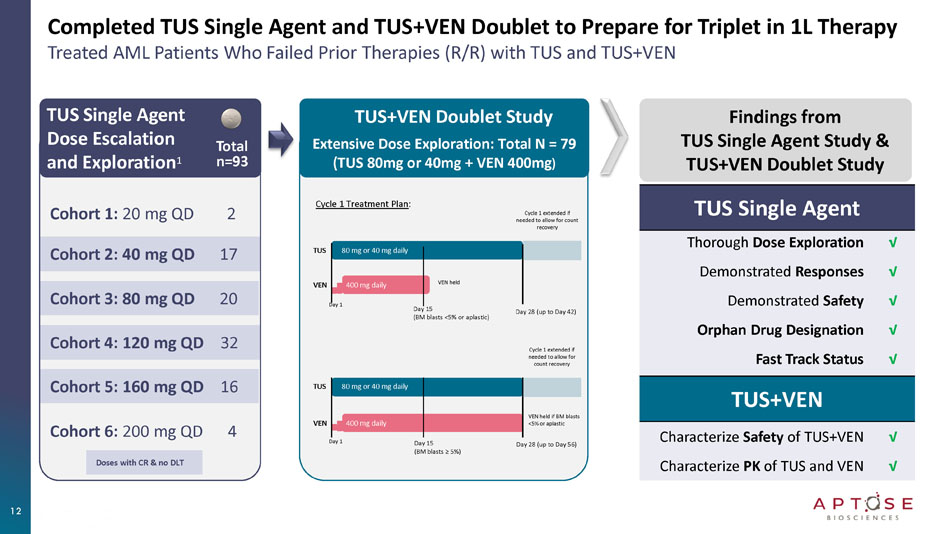 11 Solution: TUS as Superior 3 rd Agent Proof that Triplet Therapy Works ‒ Gilteritinib (Gilt) added to VEN+AZA boosts CR rate to 90% So, What’s the Problem: Gilt proves “Triplet Therapy” works, but has Limitations ‒ Gilt active in 30% of patients (harbor FLT3 mutation) ‒ Gilt not active in 70% of patients (no FLT3 mutation) ‒ Gilt adds excessive toxicities to the VEN+AZA backbone New Treatment Paradigm with Triple Drug Therapy for Newly Diagnosed AML Adding a Targeted Agent to the VEN+AZA Backbone Therapy TUS has a cleaner safety profile TUS has broader activity TUS is active in Gilt - failure patients TUS can avoid drug resistance 1 Short et al. J Clin Oncol. 2024 Jan 26:JCO2301911. Epub ahead of print. PMID: 38277619. 11 Tuspetinib Triplet (TUS + VEN + AZA) into Newly Diagnosed AML to Improve Patient Response and Survival Outcomes CONFIDENTIAL