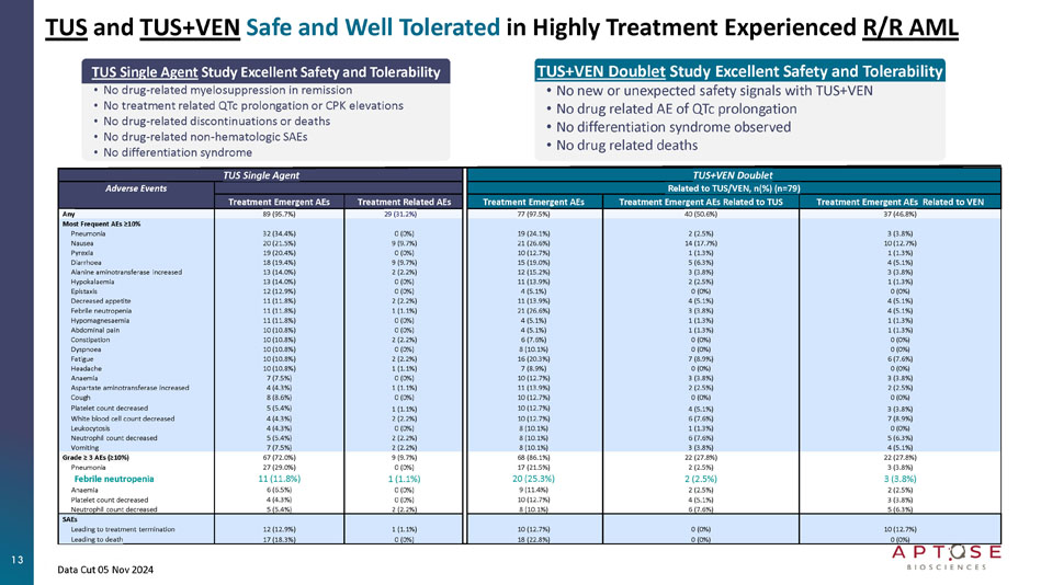 12 Completed TUS Single Agent and TUS+VEN Doublet to Prepare for Triplet in 1L Therapy Treated AML Patients Who Failed Prior Therapies (R/R) with TUS and TUS+VEN 12 Cohort 1: 20 mg QD 2 Cohort 2: 40 mg QD 17 Cohort 3: 80 mg QD 20 Cohort 4: 120 mg QD 32 Cohort 5: 160 mg QD 16 Cohort 6: 200 mg QD 4 TUS Single Agent Dose Escalation and Exploration 1 Total n=93 Doses with CR & no DLT TUS+VEN Doublet Study Extensive Dose Exploration: Total N = 79 (TUS 80mg or 40mg + VEN 400mg ) Cycle 1 Treatment Plan : Day 1 Day 15 (BM blasts <5% or aplastic) Day 28 (up to Day 42) TUS 80 mg or 40 mg daily VEN 400 mg daily VEN held Cycle 1 extended if needed to allow for count recovery VEN held if BM blasts <5% or aplastic Day 1 Day 15 (BM blasts ≥ 5%) Day 28 (up to Day 56) Cycle 1 extended if needed to allow for count recovery TUS Single Agent √ Thorough Dose Exploration √ Demonstrated Responses √ Demonstrated Safety √ Orphan Drug Designation √ Fast Track Status TUS+VEN √ Characterize Safety of TUS+VEN √ Characterize PK of TUS and VEN Findings from TUS Single Agent Study & TUS+VEN Doublet Study TUS 80 mg or 40 mg daily VEN 400 mg daily