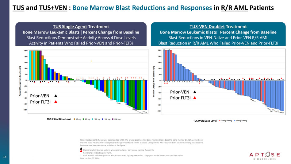 13 13 TUS and TUS+VEN Safe and Well Tolerated in Highly Treatment Experienced R/R AML TUS+VEN Doublet TUS Single Agent Related to TUS/VEN, n(%) (n=79) Adverse Events Treatment Emergent AEs Related to VEN Treatment Emergent AEs Related to TUS Treatment Emergent AEs Treatment Related AEs Treatment Emergent AEs 37 (46.8%) 40 (50.6%) 77 (97.5%) 29 (31.2%) 89 (95.7%) Any Most Frequent AEs ≥10% 3 (3.8%) 2 (2.5%) 19 (24.1%) 0 (0%) 32 (34.4%) Pneumonia 10 (12.7%) 14 (17.7%) 21 (26.6%) 9 (9.7%) 20 (21.5%) Nausea 1 (1.3%) 1 (1.3%) 10 (12.7%) 0 (0%) 19 (20.4%) Pyrexia 4 (5.1%) 5 (6.3%) 15 (19.0%) 9 (9.7%) 18 (19.4%) Diarrhoea 3 (3.8%) 3 (3.8%) 12 (15.2%) 2 (2.2%) 13 (14.0%) Alanine aminotransferase increased 1 (1.3%) 2 (2.5%) 11 (13.9%) 0 (0%) 13 (14.0%) Hypokalaemia 0 (0%) 0 (0%) 4 (5.1%) 0 (0%) 12 (12.9%) Epistaxis 4 (5.1%) 4 (5.1%) 11 (13.9%) 2 (2.2%) 11 (11.8%) Decreased appetite 4 (5.1%) 3 (3.8%) 21 (26.6%) 1 (1.1%) 11 (11.8%) Febrile neutropenia 1 (1.3%) 1 (1.3%) 4 (5.1%) 0 (0%) 11 (11.8%) Hypomagnesaemia 1 (1.3%) 1 (1.3%) 4 (5.1%) 0 (0%) 10 (10.8%) Abdominal pain 0 (0%) 0 (0%) 6 (7.6%) 2 (2.2%) 10 (10.8%) Constipation 0 (0%) 0 (0%) 8 (10.1%) 0 (0%) 10 (10.8%) Dyspnoea 6 (7.6%) 7 (8.9%) 16 (20.3%) 2 (2.2%) 10 (10.8%) Fatigue 0 (0%) 0 (0%) 7 (8.9%) 1 (1.1%) 10 (10.8%) Headache 3 (3.8%) 3 (3.8%) 10 (12.7%) 0 (0%) 7 (7.5%) Anaemia 2 (2.5%) 2 (2.5%) 11 (13.9%) 1 (1.1%) 4 (4.3%) Aspartate aminotransferase increased 0 (0%) 0 (0%) 10 (12.7%) 0 (0%) 8 (8.6%) Cough 3 (3.8%) 4 (5.1%) 10 (12.7%) 1 (1.1%) 5 (5.4%) Platelet count decreased 7 (8.9%) 6 (7.6%) 10 (12.7%) 2 (2.2%) 4 (4.3%) White blood cell count decreased 0 (0%) 1 (1.3%) 8 (10.1%) 0 (0%) 4 (4.3%) Leukocytosis 5 (6.3%) 6 (7.6%) 8 (10.1%) 2 (2.2%) 5 (5.4%) Neutrophil count decreased 4 (5.1%) 3 (3.8%) 8 (10.1%) 2 (2.2%) 7 (7.5%) Vomiting 22 (27.8%) 22 (27.8%) 68 (86.1%) 9 (9.7%) 67 (72.0%) Grade ≥ 3 AEs (≥10%) 3 (3.8%) 2 (2.5%) 17 (21.5%) 0 (0%) 27 (29.0%) Pneumonia 3 (3.8%) 2 (2.5%) 20 (25.3%) 1 (1.1%) 11 (11.8%) Febrile neutropenia 2 (2.5%) 2 (2.5%) 9 (11.4%) 0 (0%) 6 (6.5%) Anaemia 3 (3.8%) 4 (5.1%) 10 (12.7%) 0 (0%) 4 (4.3%) Platelet count decreased 5 (6.3%) 6 (7.6%) 8 (10.1%) 2 (2.2%) 5 (5.4%) Neutrophil count decreased SAEs 10 (12.7%) 0 (0%) 10 (12.7%) 1 (1.1%) 12 (12.9%) Leading to treatment termination 0 (0%) 0 (0%) 18 (22.8%) 0 (0%) 17 (18.3%) Leading to death Data Cut 05 Nov 2024 • No drug - related myelosuppression in remission • No treatment related QTc prolongation or CPK elevations • No drug - related discontinuations or deaths • No drug - related non - hematologic SAEs • No differentiation syndrome TUS Single Agent Study Excellent Safety and Tolerability • No new or unexpected safety signals with TUS+VEN • No drug related AE of QTc prolongation • No differentiation syndrome observed • No drug related deaths TUS+VEN Doublet Study Excellent Safety and Tolerability