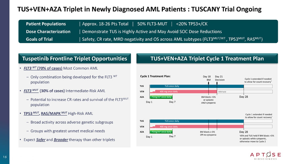 14 14 TUS Single Agent Treatment Bone Marrow Leukemic Blasts │Percent Change from Baseline Blast Reductions Demonstrate Activity Across 4 Dose Levels Activity in Patients Who Failed Prior - VEN and Prior - FLT3i Note: Blast percent change was calculated as 100 X (the lowest post - baseline bone marrow blast - baseline bone marrow blast)/bas eline bone marrow blast. Patients with blast percent change >=100% are shown as 100%. Only patients who reported both baseline and any p ost - baseline bone marrow blast results are included in the figure. Black triangle indicates patients who received prior Ven before starting Tuspetinib . Red triangle indicates prior FLT3i. * Black asterisk indicates patients who administered hydoxyurea within 7 days prior to the lowest marrow blast value Data cut Nov 05, 2024 TUS and TUS+VEN : Bone Marrow Blast Reductions and Responses in R/R AML Patients Prior - VEN Prior FLT3i TUS Initial Dose Level TUS+VEN Dose Level TUS - VEN Doublet Treatment Bone Marrow Leukemic Blasts │Percent Change from Baseline Blast Reductions in VEN - Naïve and Prior - VEN R/R AML Blast Reduction in R/R AML Who Failed Prior - VEN and Prior - FLT3i Prior - VEN Prior FLT3i * *