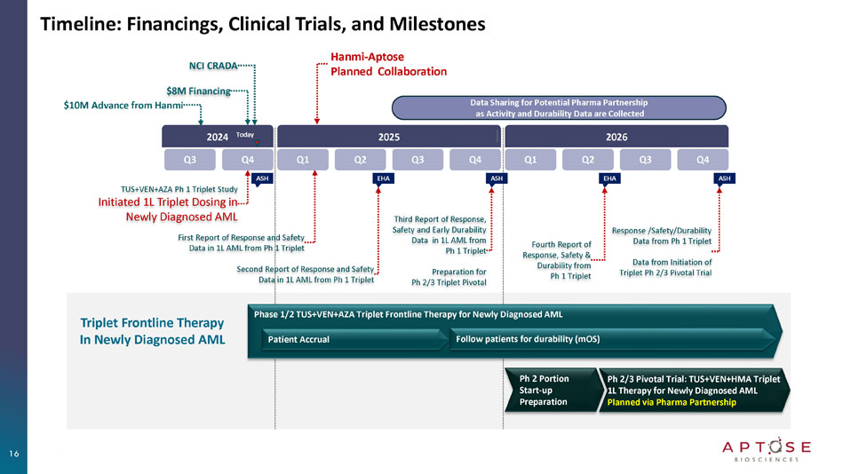15 TUS+VEN+AZA Triplet in Newly Diagnosed AML Patients : TUSCANY Trial Ongoing 15 • FLT3 WT (70% of cases) Most Common AML ‒ Only combination being developed for the FLT3 WT population • FLT3 MUT (30% of cases) Intermediate - Risk AML ‒ Potential to increase CR rates and survival of the FLT3 MUT population • TP53 MUT , RAS/MAPK MUT High - Risk AML ‒ Broad activity across adverse genetic subgroups ‒ Groups with greatest unmet medical needs • Expect Safer and Broader therapy than other triplets Tuspetinib Frontline Triplet Opportunities Patient Populations │ Approx. 18 - 26 Pts Total │ 50% FLT3 - MUT │ <20% TP53+/CK Dose Characterization │ Demonstrate TUS is Highly Active and May Avoid SOC Dose Reductions Goals of Trial │ Safety, CR rate, MRD negativity and OS across AML subtypes (FLT3 MUT/WT , TP53 MUT , RAS MUT ) TUS+VEN+AZA Triplet Cycle 1 Treatment Plan