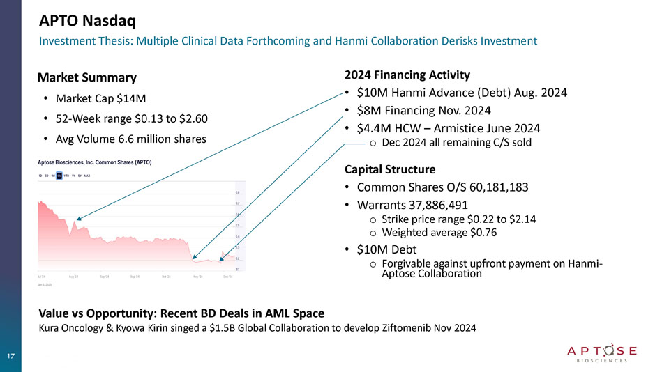 16 Q4 2024 ASH ASH EHA Triplet Frontline Therapy In Newly Diagnosed AML Timeline : Financings , Clinical Trials, and Milestones ASH EHA Q1 Q2 Q3 Q4 2025 Q1 Q2 Q3 Q4 2026 TUS+VEN+AZA Ph 1 Triplet Study Initiated 1L Triplet Dosing in Newly Diagnosed AML First Report of Response and Safety Data in 1L AML from Ph 1 Triplet Second Report of Response and Safety Data in 1L AML from Ph 1 Triplet Third Report of Response , Safety and Early Durability Data in 1L AML from Ph 1 Triplet Preparation for Ph 2/3 Triplet Pivotal Fourth Report of Response, Safety & Durability from Ph 1 Triplet 16 Response /Safety/Durability Data from Ph 1 Triplet Data from Initiation of Triplet Ph 2/3 Pivotal Trial Ph 2 Portion Start - up Preparation Ph 2/3 Pivotal Trial: TUS+VEN+HMA Triplet 1L Therapy for Newly Diagnosed AML Planned via Pharma Partnership Today Phase 1/2 TUS+VEN+AZA Triplet Frontline Therapy for Newly Diagnosed AML Follow patients for durability (mOS) Patient Accrual Q3 $10M Advance from Hanmi $8M Financing Hanmi - Aptose Planned Collaboration NCI CRADA Data Sharing for Potential Pharma Partnership as Activity and Durability Data are Collected