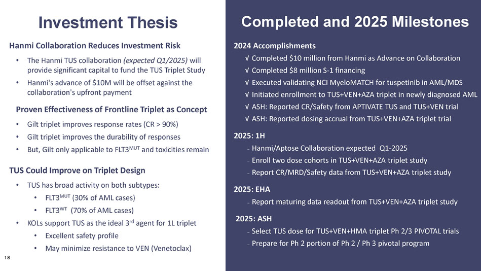 17 APTO Nasdaq Market Summary • Market Cap $14M • 52 - Week range $0.13 to $2.60 • Avg Volume 6.6 million shares Investment Thesis: Multiple Clinical Data Forthcoming and Hanmi Collaboration Derisks Investment 17 2024 Financing Activity • $10M Hanmi Advance (Debt) Aug. 2024 • $8M Financing Nov. 2024 • $4.4M HCW – Armistice June 2024 o Dec 2024 all remaining C/S sold Capital Structure • Common Shares O/S 60,181,183 • Warrants 37,886,491 o Strike price range $0.22 to $2.14 o Weighted average $0.76 • $10M Debt o Forgivable against upfront payment on Hanmi - Aptose Collaboration Value vs Opportunity: Recent BD Deals in AML Space Kura Oncology & Kyowa Kirin singed a $1.5B Global Collaboration to develop Ziftomenib Nov 2024