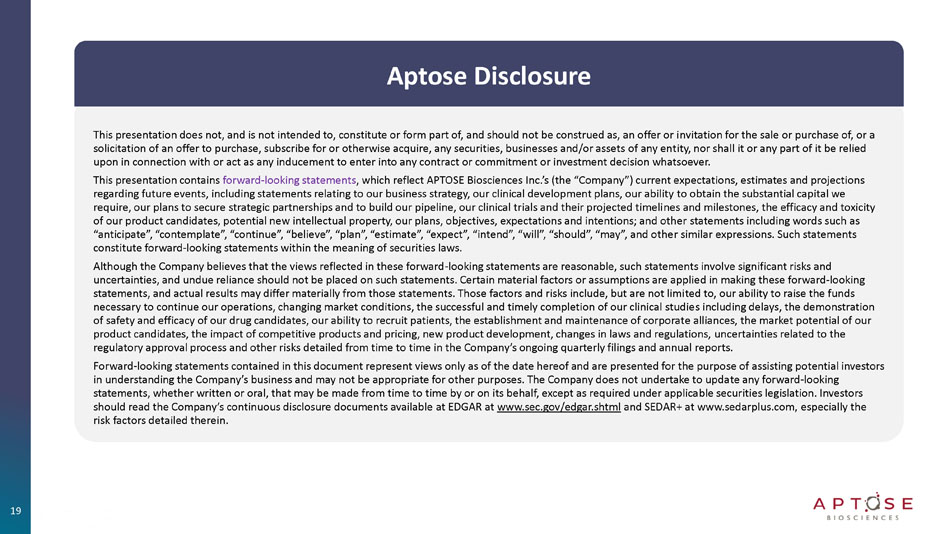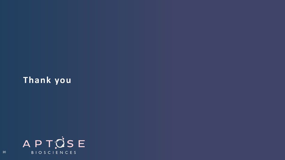 19 19 Aptose Disclosure This presentation does not, and is not intended to, constitute or form part of, and should not be construed as, an offer or i nvi tation for the sale or purchase of, or a solicitation of an offer to purchase, subscribe for or otherwise acquire, any securities, businesses and/or assets of any ent ity , nor shall it or any part of it be relied upon in connection with or act as any inducement to enter into any contract or commitment or investment decision whatsoever. This presentation contains forward - looking statements , which reflect APTOSE Biosciences Inc.’s (the “Company”) current expectations, estimates and projections regarding future events, including statements relating to our business strategy, our clinical development plans, our ability to obtain the substantial capital we require, our plans to secure strategic partnerships and to build our pipeline, our clinical trials and their projected timeli nes and milestones, the efficacy and toxicity of our product candidates, potential new intellectual property, our plans, objectives, expectations and intentions; and other st atements including words such as “anticipate”, “contemplate”, “continue”, “believe”, “plan”, “estimate”, “expect”, “intend”, “will”, “should”, “may”, and othe r s imilar expressions. Such statements constitute forward - looking statements within the meaning of securities laws. Although the Company believes that the views reflected in these forward - looking statements are reasonable, such statements invol ve significant risks and uncertainties, and undue reliance should not be placed on such statements. Certain material factors or assumptions are applie d i n making these forward - looking statements, and actual results may differ materially from those statements. Those factors and risks include, but are not limi ted to, our ability to raise the funds necessary to continue our operations, changing market conditions, the successful and timely completion of our clinical studie s i ncluding delays, the demonstration of safety and efficacy of our drug candidates, our ability to recruit patients, the establishment and maintenance of corporat e a lliances, the market potential of our product candidates, the impact of competitive products and pricing, new product development, changes in laws and regulations, un certainties related to the regulatory approval process and other risks detailed from time to time in the Company’s ongoing quarterly filings and annual rep orts. Forward - looking statements contained in this document represent views only as of the date hereof and are presented for the purpo se of assisting potential investors in understanding the Company’s business and may not be appropriate for other purposes. The Company does not undertake to upda te any forward - looking statements, whether written or oral, that may be made from time to time by or on its behalf, except as required under applica ble securities legislation. Investors should read the Company’s continuous disclosure documents available at EDGAR at www.sec.gov/edgar.shtml and SEDAR+ at www.sedarplus.com, especially the risk factors detailed therein.