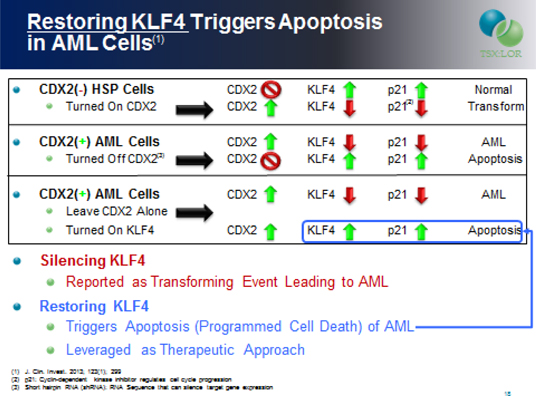The Cdx2 Gene, while not materially expressed in the bone marrow and blood cells of normal adults, was observed to be active in the malignant cells in a majority of patients with AML. It was subsequently noted that a screen of other genes affected by the expression of the Cdx2 Gene, and its protein product (“CDX2 Protein”), identified the Klf4 Gene as significantly impacted. It was proposed that CDX2 Protein affects KLF4 Protein levels by binding and epigenetically silencing the Klf4 Gene (Faber et. al., J Clin Invest. 2013;123(1):299–314). In other words, while the DNA base sequence remains unaltered, the transcriptional machinery around those bases are modified chemically to reduce the expression of the gene. In subsequent studies from Faber et. al., it was demonstrated that induction of the Cdx2 Gene, in cells lacking CDX2 Protein, subsequently decreased KLF4 Protein levels and promoted proliferation (Figure 1, First Bullet), while silencing the Cdx2 Gene in cells possessing CDX2 Protein alleviated the suppression of the Klf4 Gene and restored innate function (Figure 1, Second Bullet) to drive cellular apoptosis (programmed cell death) in AML cells. Further, in cells possessing an active Cdx2 Gene, Faber et. al. inserted an active Klf4 Gene to overcome innate KLF4 Protein suppression, and revealed that increased KLF4 Protein promoted apoptosis (Figure 1, Third Bullet).